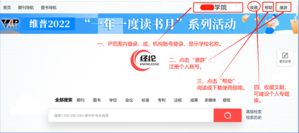 校园网范围内,访问网址,直接登录系统(通过漫游账号注册拥有更多权限的同时可通过收藏功能管理个人的检索资源);采用图示方式登录,右上角均显示机构账号名称。